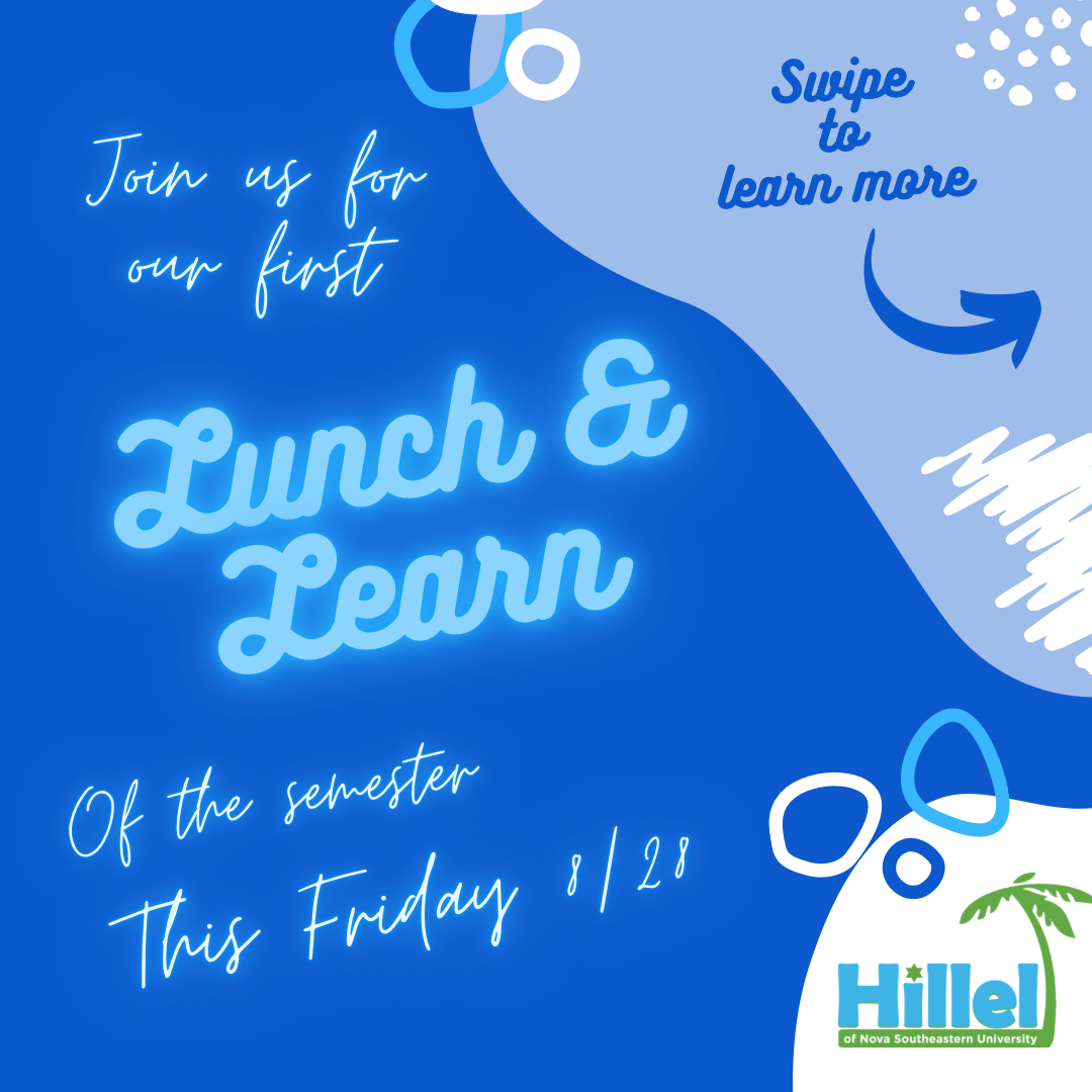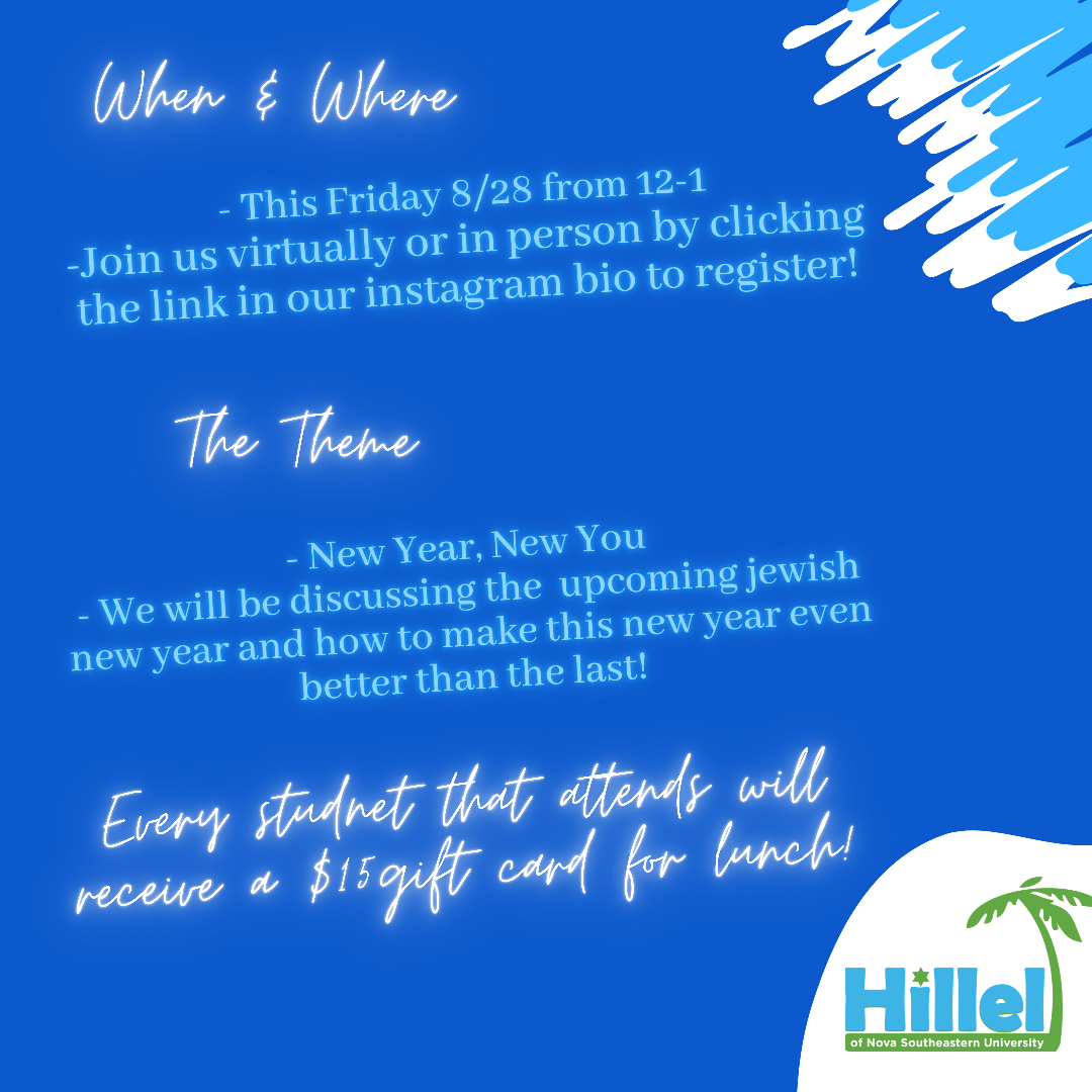 NSU Students! Join us on Friday, August 28th at 12PM on ZOOM for our First Shabbat Lunch and Learn of the semester! Our favorite pink-haired Rabbi will be leading an awesome session regarding the upcoming Jewish New Year and how we will make this new year better than the last! Please register at https://tinyurl.com/hillelsharks ! If space permits, on campus students will be able to join us socially distanced in person for the Lunch and Learn. Please select if you would like to do so, and Rachel will reach out to confirm with you about availability. All students who attend will receive a $15 gift card to go towards your lunch!