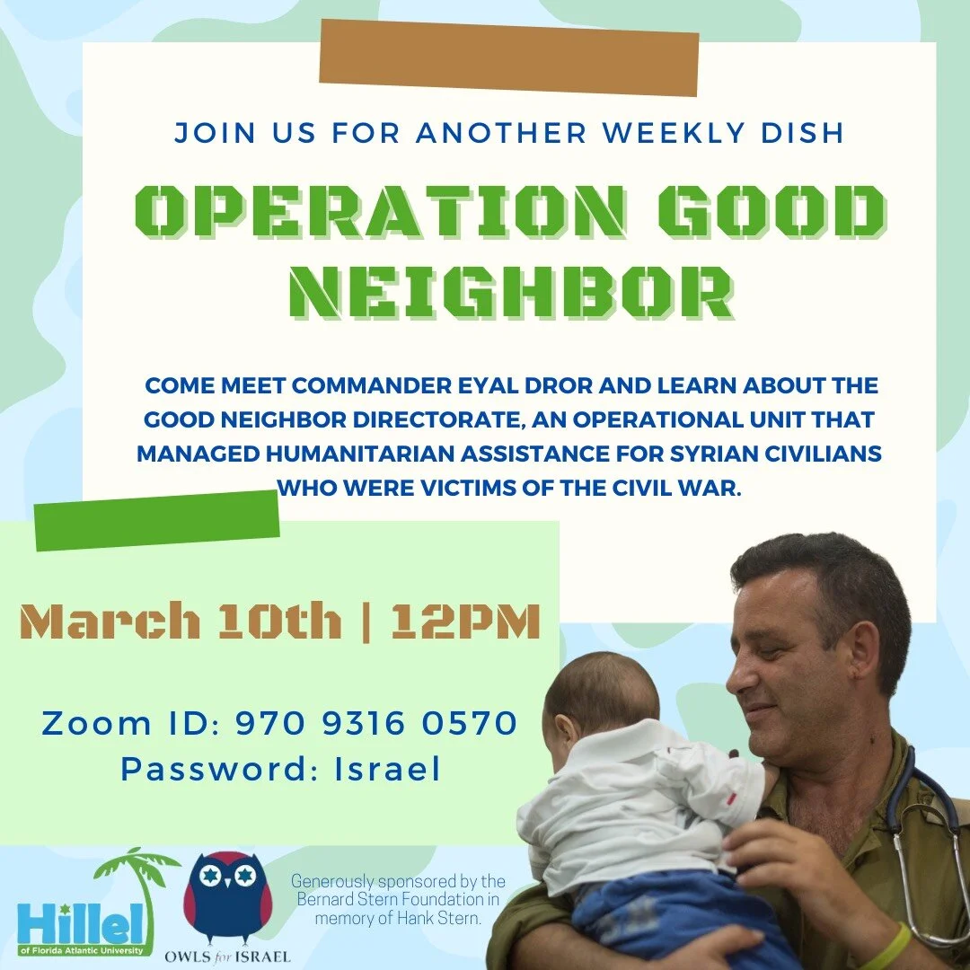 The Weekly Dish: Operation Good Neighbor Wednesday, March 10, 2021 12:00 PM 1:00 PM 12:00 13:00 Hillel of Broward and Palm Beach 777 Glades Road, Bldg LY-3A Boca Raton, FL 33431 (map) Google Calendar ICS Join us this Wednesday at 12pm for a special meeting with Eyal Dror to speak about Operation Good Neighbor which was responsible for civilian aid to Syrian citizens who were affected by the Syrian Civil War. Click here to join.